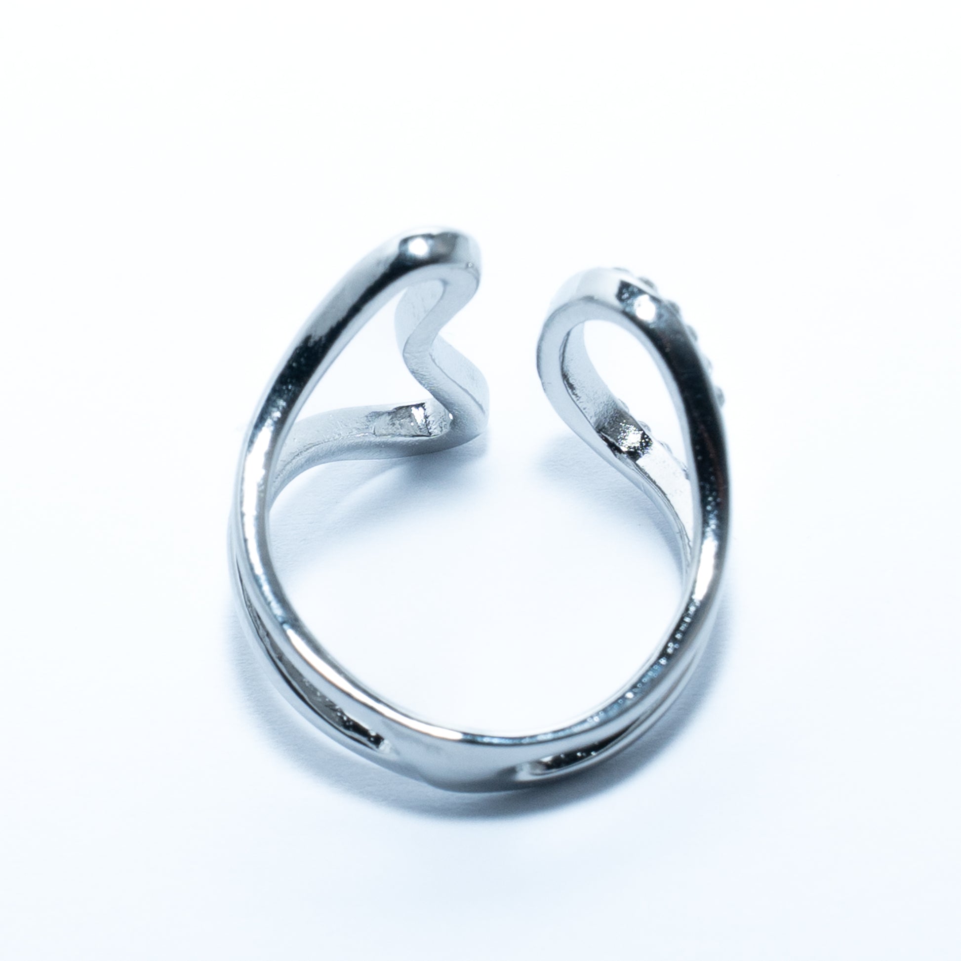 Bague argentée en acier inoxydable, sublimée par des strass étincelants. Ajustable, hypoallergénique et élégante, elle apporte éclat et modernité à toutes vos tenues.