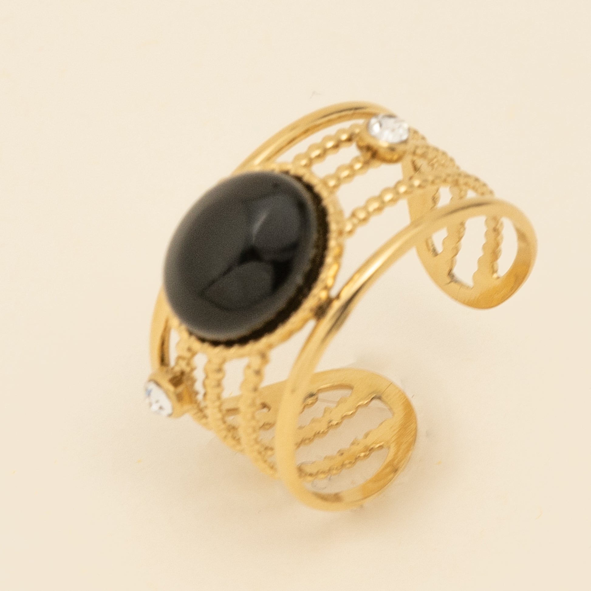 Bague dorée pierre noire ajustable – acier inoxydable waterproof
