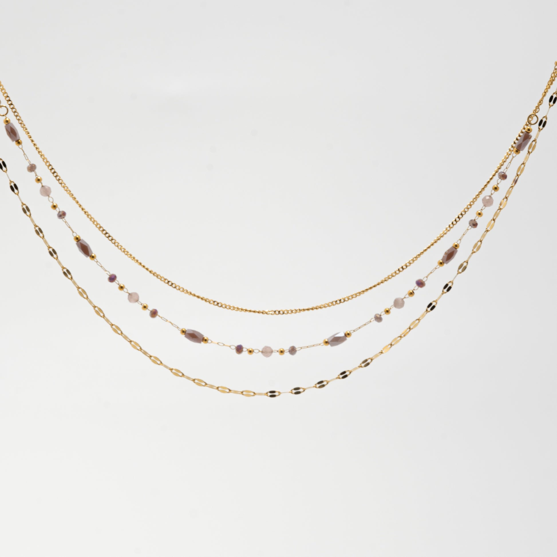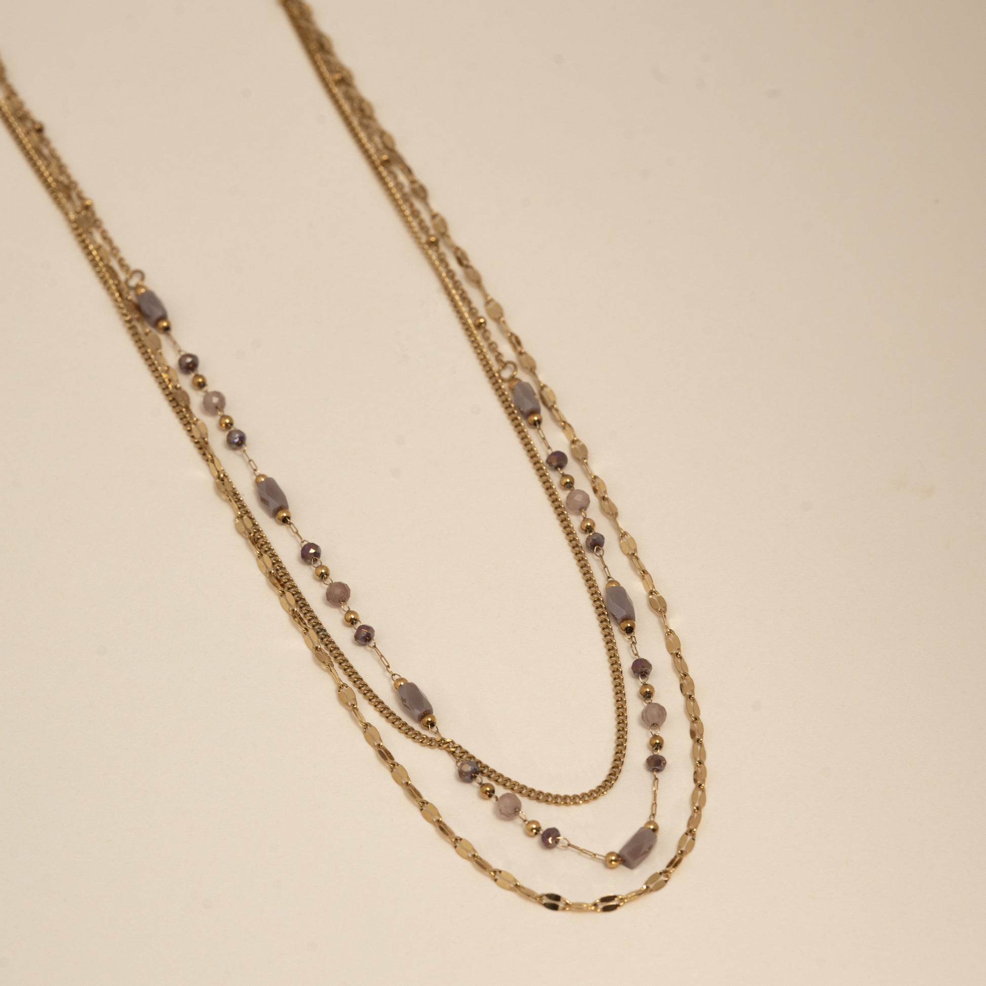 Ce collier multi-rangs doré séduit par son design raffiné et son éclat intemporel. Composé de fines chaînes dorées et de perles violettes élégantes, il joue sur les contrastes pour un style chic et moderne.